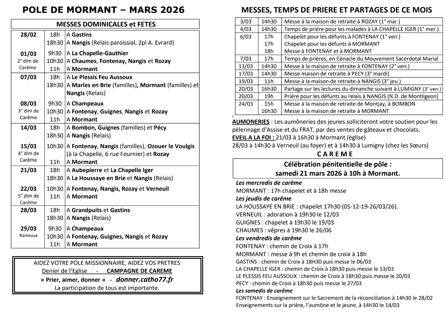 Messes et rencontres de mars 2026 dans les paroisses de Crèvecoeur en Brie, Fontenay Trésigny, Les Chapelles-Bourbon, La Houssaye en Brie, Marles en Brie, Bernay en Brie, Clos Fontaine , Courpalay, Courtomer, Gastins, Hautefeuille, La Chapelle Iger, Le Plessis Feu Aussoux, Lumigny, Nesles, Ormeaux, Pécy, Pézarches, Rozay en Brie, Touquin, Vaudoy, Voinsles, Vilbert, Andrezel, Aubepierre, Blandy, Bombon, Bréau, Mormant, Champeaux, Chatillon la Borde, Fouju, Grandpuits, La Chapelle Gauthier, Ozouer le Repos, Quiers, Saint Méry, Bailly-Carrois, Châteaubleau, Fontains, Fontenailles, La Croix en Brie, La Chapelle Rablais, Nangis, Rampillon, Saint Just en Brie, Saint Ouen en Brie, Vanvillé, Argentières, Beauvoir, Courquetaine, Chaumes en Brie, Guignes, Ozouer le Voulgis, Yèbles, Verneuil L’Étang