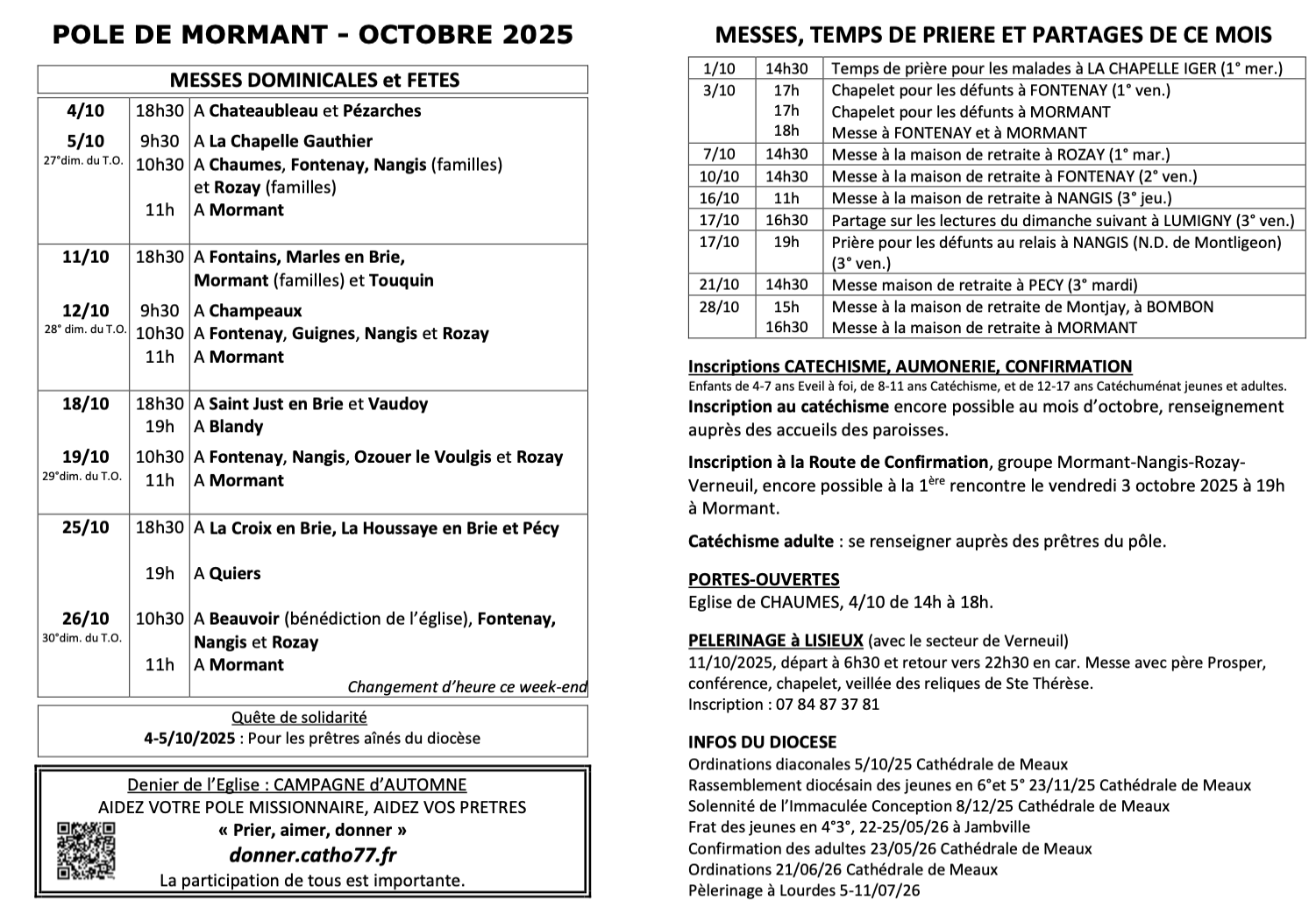 Messes et rencontres d’octobre 2025 dans les paroisses de Crèvecoeur en Brie, Fontenay Trésigny, Les Chapelles-Bourbon, La Houssaye en Brie, Marles en Brie, Bernay en Brie, Clos Fontaine , Courpalay, Courtomer, Gastins, Hautefeuille, La Chapelle Iger, Le Plessis Feu Aussoux, Lumigny, Nesles, Ormeaux, Pécy, Pézarches, Rozay en Brie, Touquin, Vaudoy, Voinsles, Vilbert, Andrezel, Aubepierre, Blandy, Bombon, Bréau, Mormant, Champeaux, Chatillon la Borde, Fouju, Grandpuits, La Chapelle Gauthier, Ozouer le Repos, Quiers, Saint Méry, Bailly-Carrois, Châteaubleau, Fontains, Fontenailles, La Croix en Brie, La Chapelle Rablais, Nangis, Rampillon, Saint Just en Brie, Saint Ouen en Brie, Vanvillé, Argentières, Beauvoir, Courquetaine, Chaumes en Brie, Guignes, Ozouer le Voulgis, Yèbles, Verneuil L’Étang