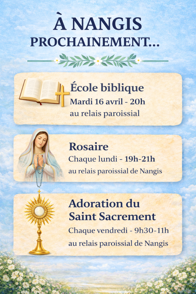 Rosaire de 19 h à 21 h tous les lundi au relais paroissial à Nangis.